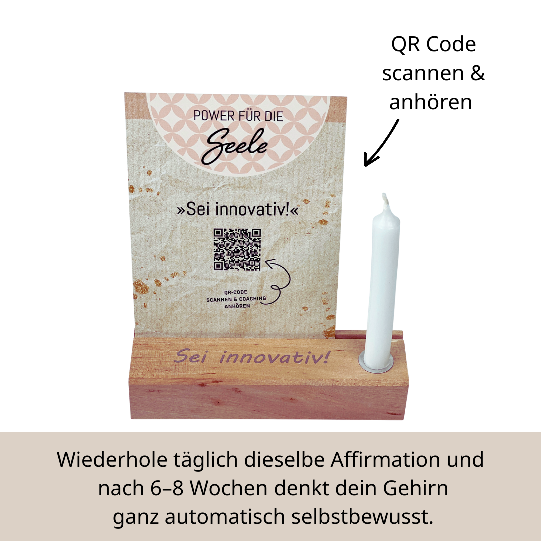 Im Mittelpunkt der Box steht ein handgefertigter Karten- und Kerzenständer aus nachhaltigem Birkenholz. Mit der Gravur „Bleib innovativ“ erinnert er dich jeden Tag daran, offen zu bleiben und mutig neue Gedanken zuzulassen. Der Ständer bringt Natur, Ruhe und gleichzeitig Inspiration in dein Zuhause, ein Symbol für kreative Stärke und Offenheit.